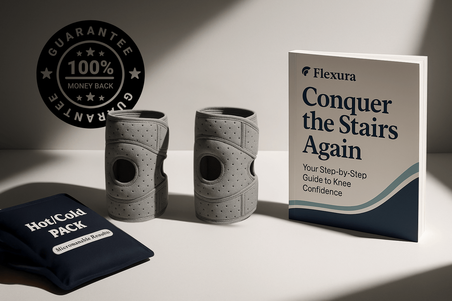 Our most popular bundle includes 2 Flexura® Pro Braces, a Hot/Cold Therapy Pack, and the Step-by-Step “Conquer the Stairs” Guide — all for just $74.99.